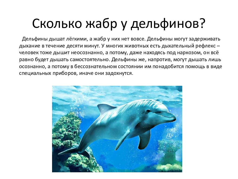 Дельфины дышат лёгкими, а жабр у них нет вовсе. Дельфины могут задерживать дыхание в течение десяти минут. У многих животных есть дыхательный рефлекс – человек тоже дышит неосознанно, а потому, даже находясь под наркозом, он всё равно будет дышать самостоятельно. Дельфины же, напротив, могут дышать лишь осознанно, а потому в бессознательном состоянии им понадобится помощь в виде специальных приборов, иначе они задохнутся.