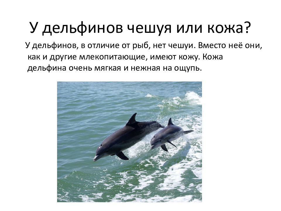 У дельфинов, в отличие от рыб, нет чешуи. Вместо неё они, как и другие млекопитающие, имеют кожу. Кожа дельфина очень мягкая и нежная на ощупь.