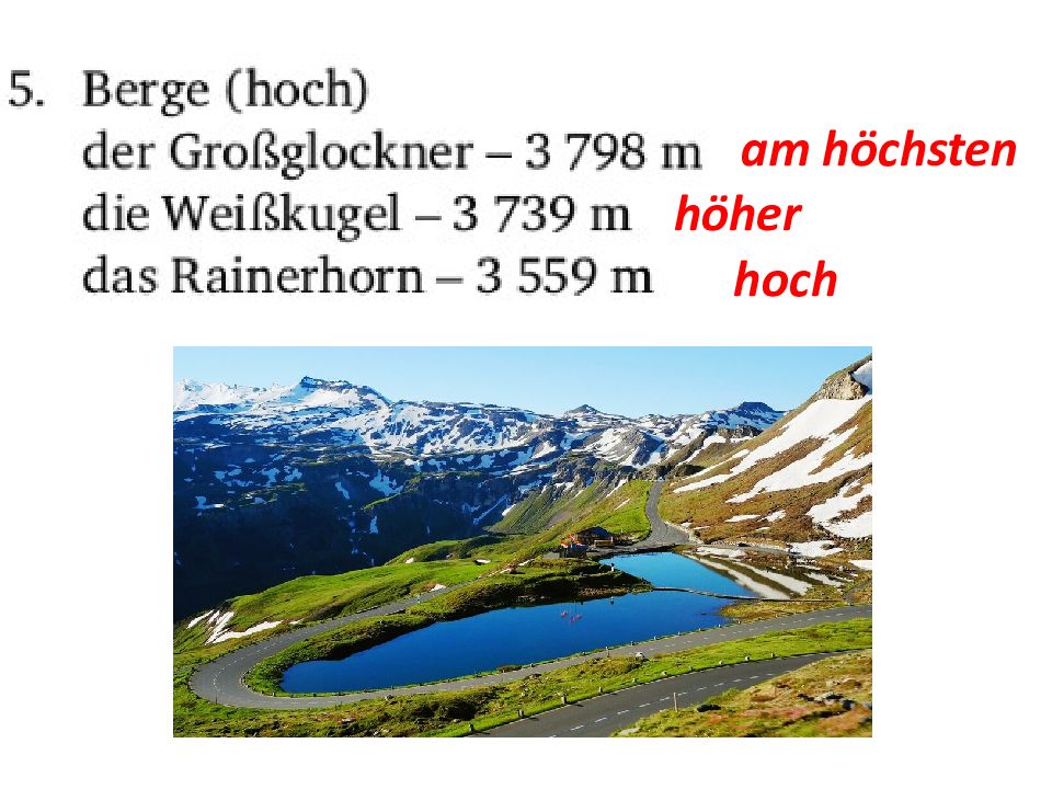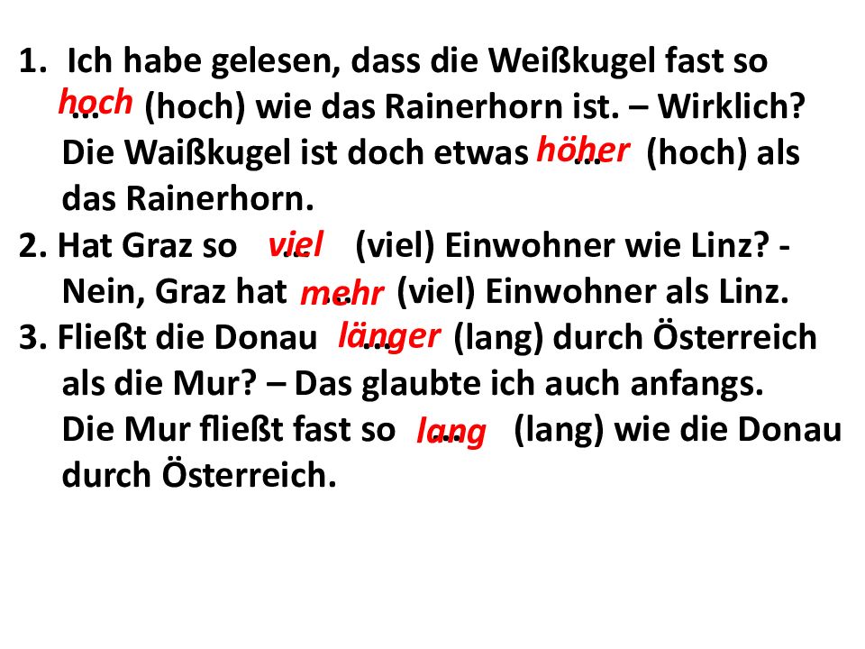 Ich habe gelesen, dass die Weißkugel fast so ... (hoch) wie das Rainerhorn ist. – Wirklich? Die Waißkugel ist doch etwas... (hoch) als das Rainerhorn. 2. Hat Graz so... (viel) Einwohner wie Linz? - Nein, Graz hat... (viel) Einwohner als Linz. 3. Fließt die Donau... (lang) durch Österreich als die Mur? – Das glaubte ich auch anfangs. Die Mur fließt fast so... (lang) wie die Donau durch Österreich. hoch höher viel mehr länger lang
