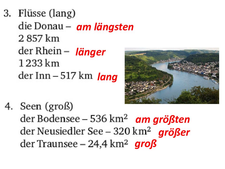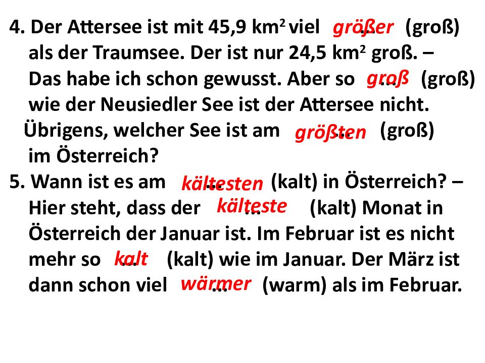 4. Der Attersee ist mit 45,9 km 2 viel... (groß) als der Traumsee. Der ist nur 24,5 km 2 groß. – Das habe ich schon gewusst. Aber so... (groß) wie der Neusiedler See ist der Attersee nicht. Übrigens, welcher See ist am... (groß) im Österreich? 5. Wann ist es am... (kalt) in Österreich? – Hier steht, dass der... (kalt) Monat in Österreich der Januar ist. Im Februar ist es nicht mehr so... (kalt) wie im Januar. Der März ist dann schon viel... (warm) als im Februar. größer groß größten kältesten kälteste kalt wärmer