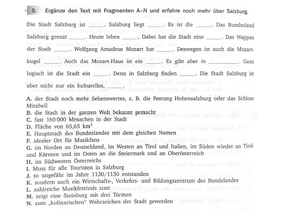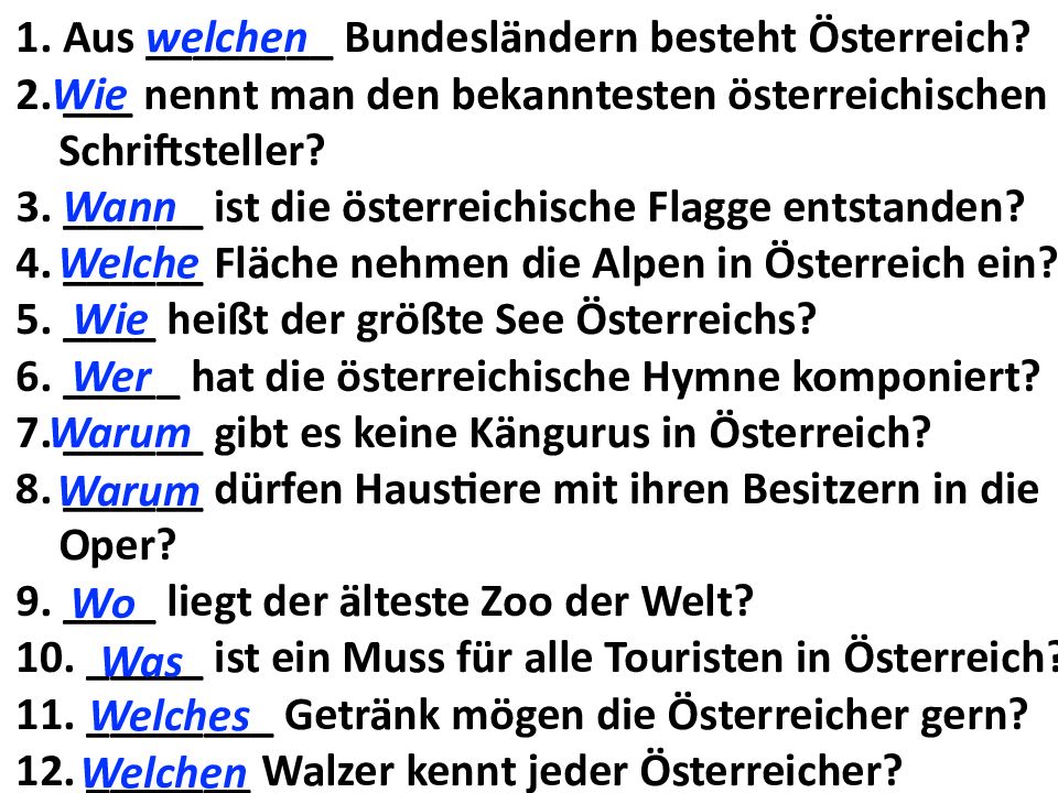 1. Aus ________ Bundesländern besteht Österreich? 2. ___ nennt man den bekanntesten österreichischen Schriftsteller? 3. ______ ist die österreichische Flagge entstanden? 4. ______ Fläche nehmen die Alpen in Österreich ein? 5. ____ heißt der größte See Österreichs? 6. _____ hat die österreichische Hymne komponiert? 7. ______ gibt es keine Kängurus in Österreich? 8. ______ dürfen Haustiere mit ihren Besitzern in die Oper? 9. ____ liegt der älteste Zoo der Welt? 10. _____ ist ein Muss für alle Touristen in Österreich? 11. ________ Getränk mögen die Österreicher gern? 12. _______ Walzer kennt jeder Österreicher? welchen Wie Wann Welche Wie Wer Warum Warum Wo Was Welches Welchen