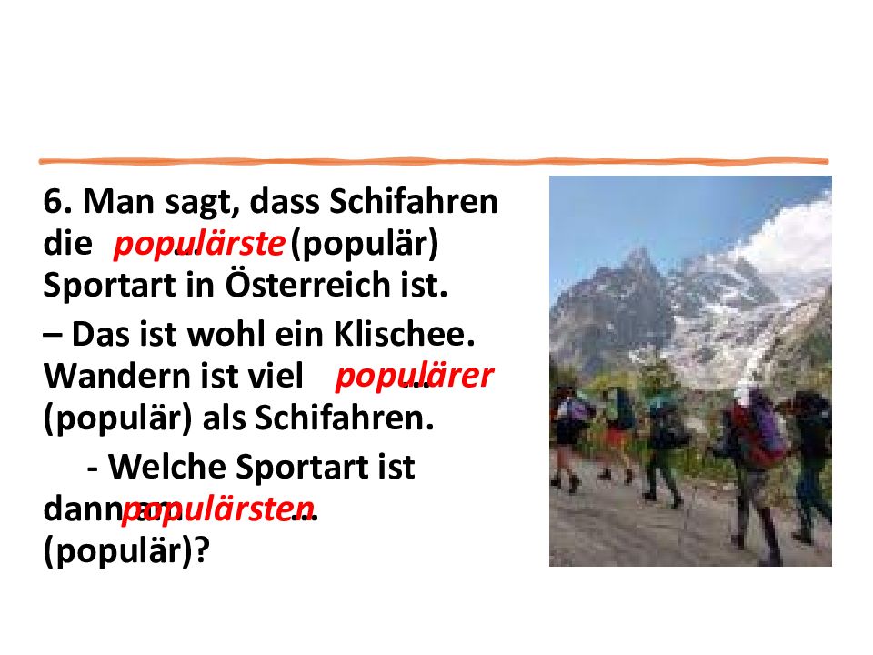 6. Man sagt, dass Schifahren die... ( populär ) Sportart in Österreich ist. – Das ist wohl ein Klischee. Wandern ist viel... ( populär ) als Schifahren. - Welche Sportart ist dann am... ( populär )? populärste populärer populärsten
