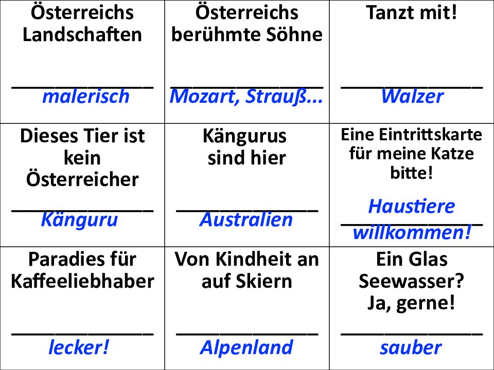 Österreichs Landschaften _____________ Österreichs berühmte Söhne ______________ Tanzt mit! _____________ Dieses Tier ist kein Österreicher _____________ Kängurus sind hier _____________ Eine Eintrittskarte für meine Katze bitte! _____________ Paradies für Kaffeeliebhaber _____________ Von Kindheit an auf Skiern _____________ Ein Glas Seewasser? Ja, gerne! _____________ malerisch Mozart, Strauß... Walzer Känguru Australien Haustiere willkommen! lecker! Alpenland sauber