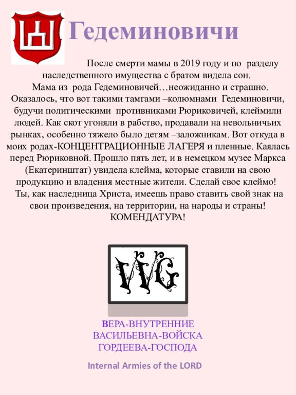 Гедеминовичи Internal Armies of the LORD После смерти мамы в 2019 году и по разделу наследственного имущества с братом видела сон. Мама из рода Гедеминовичей …неожиданно и страшно. Оказалось, что вот такими тамгами – колюмнами Гедеминовичи, будучи политическими противниками Рюриковичей, клеймили людей. Как скот угоняли в рабство, продавали на невольничьих рынках, особенно тяжело было детям –заложникам. Вот откуда в моих родах-КОНЦЕНТРАЦИОННЫЕ ЛАГЕРЯ и пленные. Каялась перед Рюриковной. Прошло пять лет, и в немецком музее Маркса (Екатеринштат) увидела клейма, которые ставили на свою продукцию и владения местные жители. Сделай свое клеймо! Ты, как наследница Христа, имеешь право ставить свой знак на свои произведения, на территории, на народы и страны! КОМЕНДАТУРА! В ера-Внутренние Васильевна-войска Гордеева-Господа
