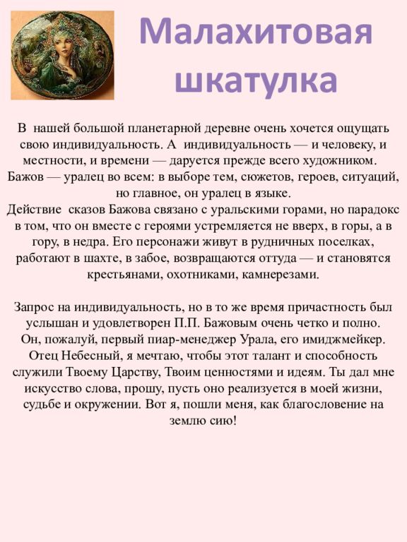 Малахитовая шкатулка В нашей большой планетарной деревне очень хочется ощущать свою индивидуальность. А индивидуальность — и человеку, и местности, и времени — даруется прежде всего художником. Бажов — уралец во всем: в выборе тем, сюжетов, героев, ситуаций, но главное, он уралец в языке. Действие сказов Бажова связано с уральскими горами, но парадокс в том, что он вместе с героями устремляется не вверх, в горы, а в гору, в недра. Его персонажи живут в рудничных поселках, работают в шахте, в забое, возвращаются оттуда — и становятся крестьянами, охотниками, камнерезами. Запрос на индивидуальность, но в то же время причастность был услышан и удовлетворен П.П. Бажовым очень четко и полно. Он, пожалуй, первый пиар-менеджер Урала, его имиджмейкер. Отец Небесный, я мечтаю, чтобы этот талант и способность служили Твоему Царству, Твоим ценностями и идеям. Ты дал мне искусство слова, прошу, пусть оно реализуется в моей жизни, судьбе и окружении. Вот я, пошли меня, как благословение на землю сию!