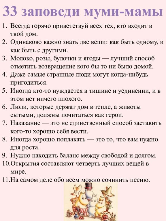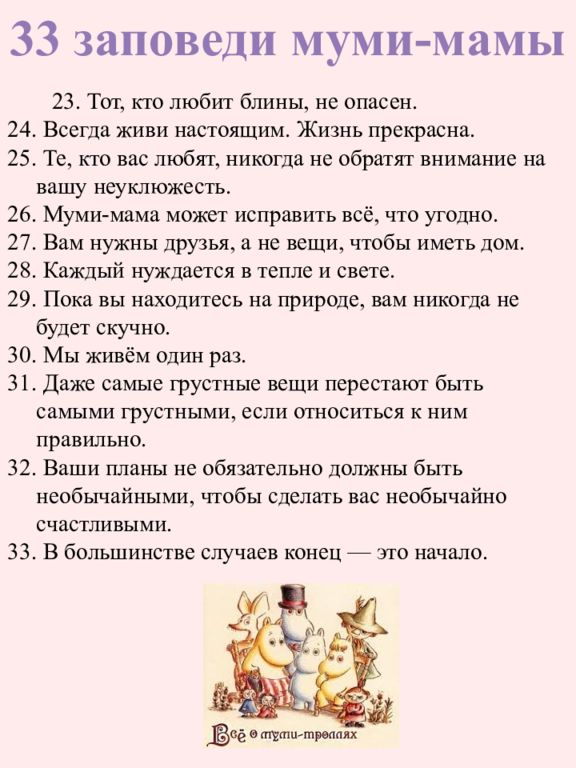 33 заповеди муми-мамы 23. Тот, кто любит блины, не опасен. 24. Всегда живи настоящим. Жизнь прекрасна. 25. Те, кто вас любят, никогда не обратят внимание на вашу неуклюжесть. 26. Муми-мама может исправить всё, что угодно. 27. Вам нужны друзья, а не вещи, чтобы иметь дом. 28. Каждый нуждается в тепле и свете. 29. Пока вы находитесь на природе, вам никогда не будет скучно. 30. Мы живём один раз. 31. Даже самые грустные вещи перестают быть самыми грустными, если относиться к ним правильно. 32. Ваши планы не обязательно должны быть необычайными, чтобы сделать вас необычайно счастливыми. 33. В большинстве случаев конец — это начало.