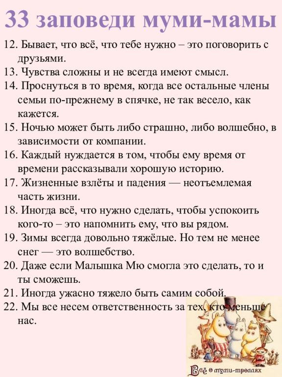 33 заповеди муми-мамы 12. Бывает, что всё, что тебе нужно – это поговорить с друзьями. 13. Чувства сложны и не всегда имеют смысл. 14. Проснуться в то время, когда все остальные члены семьи по-прежнему в спячке, не так весело, как кажется. 15. Ночью может быть либо страшно, либо волшебно, в зависимости от компании. 16. Каждый нуждается в том, чтобы ему время от времени рассказывали хорошую историю. 17. Жизненные взлёты и падения — неотъемлемая часть жизни. 18. Иногда всё, что нужно сделать, чтобы успокоить кого-то – это напомнить ему, что вы рядом. 19. Зимы всегда довольно тяжёлые. Но тем не менее снег — это волшебство. 20. Даже если Малышка Мю смогла это сделать, то и ты сможешь. 21. Иногда ужасно тяжело быть самим собой. 22. Мы все несем ответственность за тех, кто меньше нас.