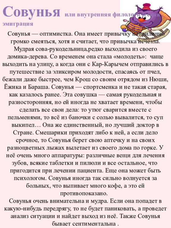 Совунья или внутренняя филологическая эмиграция Совунья — оптимистка. Она имеет привычку неприлично громко смеяться, хотя и считает, что привычка исчезла. Мудрая сова-рукодельница,редко выходила из своего домика-дерева. Со временем она стала «молодеть»: чаще выходить на улицу, а когда они с Кар-Карычем отправились в путешествие за эликсиром молодости, спасаясь от пчел, бежали даже быстрее, чем Крош со своим отрядом из Нюши, Ёжика и Бараша. Совунья — спортсменка и не такая старая, как казалось ранее. Эта совушка — самая рукодельная и разносторонняя, но ей иногда не хватает времени, чтобы сделать все свои дела: то утюг сварится вместе с пельменями, то всё из баночки с солью вывалится, то суп выкипел… Она же единственный, но лучший доктор в Стране. Смешарики приходят либо к ней, а если дело срочное, то Совунья берет свою аптечку и на своих разноцветных лыжах вылетает из своего дома по горке. У неё очень много аппаратуры: различные вещи для лечения зубов, всякие таблетки и пилюли и все остальное, что пригодится при лечении пациента. Еще она может быть психологом. Совунья иногда так сильно волнуется за больных, что выпивает много кофе, а это ей противопоказано. Совунья очень внимательна и мудра. Если она попадет в какую-нибудь передрягу, то не будет паниковать, а проведет анализ ситуации и найдет выход из неё. Также Совунья бывает сентиментальна.