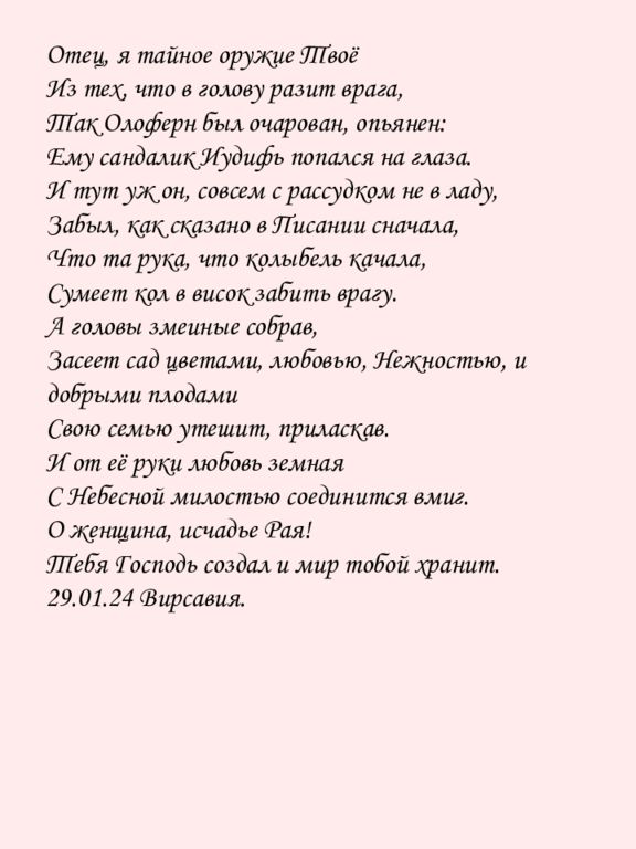 Отец, я тайное оружие Твоё Из тех, что в голову разит врага, Так Олоферн был очарован, опьянен: Ему сандалик Иудифь попался на глаза. И тут уж он, совсем с рассудком не в ладу, Забыл, как сказано в Писании сначала, Что та рука, что колыбель качала, Сумеет кол в висок забить врагу. А головы змеиные собрав, Засеет сад цветами, любовью, Нежностью, и добрыми плодами Свою семью утешит, приласкав. И от её руки любовь земная С Небесной милостью соединится вмиг. О женщина, исчадье Рая! Тебя Господь создал и мир тобой хранит. 29.01.24 Вирсавия.
