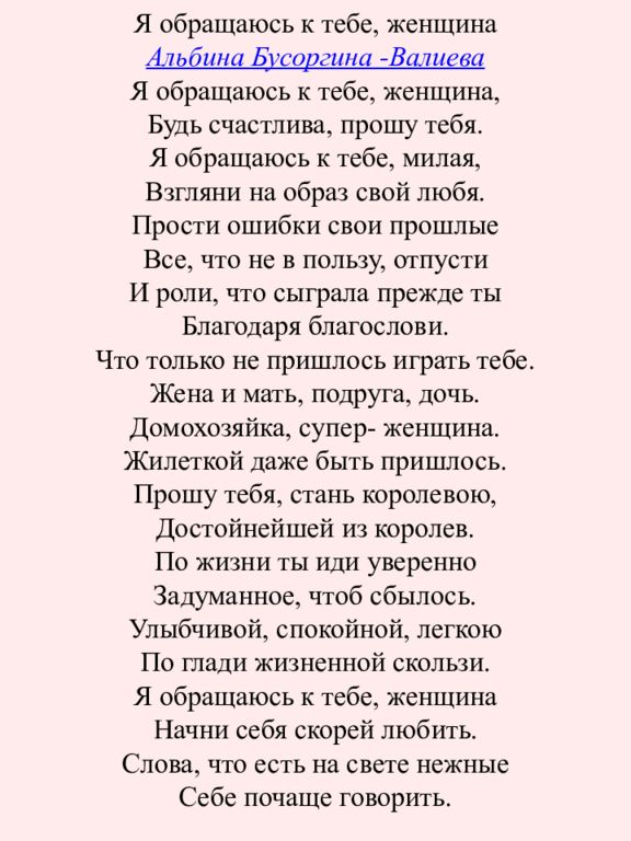 Я обращаюсь к тебе, женщина Альбина Бусоргина -Валиева Я обращаюсь к тебе, женщина, Будь счастлива, прошу тебя. Я обращаюсь к тебе, милая, Взгляни на образ свой любя. Прости ошибки свои прошлые Все, что не в пользу, отпусти И роли, что сыграла прежде ты Благодаря благослови. Что только не пришлось играть тебе. Жена и мать, подруга, дочь. Домохозяйка, супер - женщина. Жилеткой даже быть пришлось. Прошу тебя, стань королевою, Достойнейшей из королев. По жизни ты иди уверенно Задуманное, чтоб сбылось. Улыбчивой, спокойной, легкою По глади жизненной скользи. Я обращаюсь к тебе, женщина Начни себя скорей любить. Слова, что есть на свете нежные Себе почаще говорить.