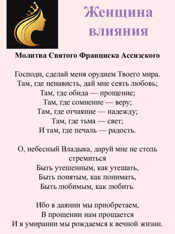 Женщина влияния Молитва Святого Франциска Ассизского Господи, сделай меня орудием Твоего мира. Там, где ненависть, дай мне сеять любовь; Там, где обида — прощение; Там, где сомнение — веру; Там, где отчаяние — надежду; Там, где тьма — свет; И там, где печаль — радость. О, небесный Владыка, даруй мне не столь стремиться Быть утешенным, как утешать, Быть понятым, как понимать, Быть любимым, как любить. Ибо в даянии мы приобретаем, В прощении нам прощается И в умирании мы рождаемся к вечной жизни.