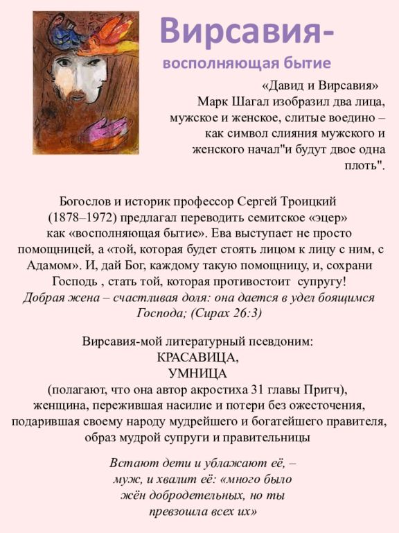 Вирсавия- восполняющая бытие «Давид и Вирсавия» Марк Шагал изобразил два лица, мужское и женское, слитые воедино – как символ слияния мужского и женского начал"и будут двое одна плоть". Богослов и историк профессор Сергей Троицкий (1878–1972) предлагал переводить семитское « эцер » как «восполняющая бытие». Ева выступает не просто помощницей, а «той, которая будет стоять лицом к лицу с ним, с Адамом». И, дай Бог, каждому такую помощницу, и, сохрани Господь, стать той, которая противостоит супругу! Добрая жена – счастливая доля: она дается в удел боящимся Господа; ( Сирах 26:3) Вирсавия-мой литературный псевдоним: КРАСАВИЦА, УМНИЦА (полагают, что она автор акростиха 31 главы Притч), женщина, пережившая насилие и потери без ожесточения, подарившая своему народу мудрейшего и богатейшего правителя, образ мудрой супруги и правительницы Встают дети и ублажают её, – муж, и хвалит её: «много было жён добродетельных, но ты превзошла всех их»
