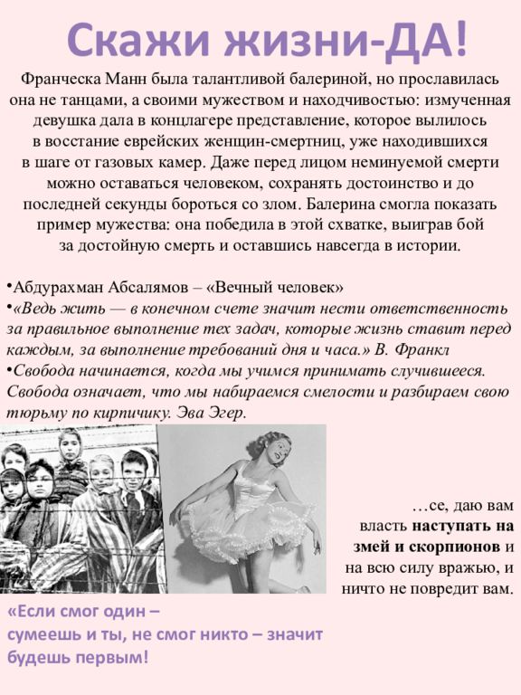 Скажи жизни-ДА ! Франческа Манн была талантливой балериной, но прославилась она не танцами, а своими мужеством и находчивостью: измученная девушка дала в концлагере представление, которое вылилось в восстание еврейских женщин-смертниц, уже находившихся в шаге от газовых камер. Даже перед лицом неминуемой смерти можно оставаться человеком, сохранять достоинство и до последней секунды бороться со злом. Балерина смогла показать пример мужества: она победила в этой схватке, выиграв бой за достойную смерть и оставшись навсегда в истории. Абдурахман Абсалямов – «Вечный человек» «Ведь жить — в конечном счете значит нести ответственность за правильное выполнение тех задач, которые жизнь ставит перед каждым, за выполнение требований дня и часа.» В. Франкл Свобода начинается, когда мы учимся принимать случившееся. Свобода означает, что мы набираемся смелости и разбираем свою тюрьму по кирпичику. Эва Эгер. «Если смог один – сумеешь и ты, не смог никто – значит будешь первым! …се, даю вам власть наступать на змей и скорпионов и на всю силу вражью, и ничто не повредит вам.