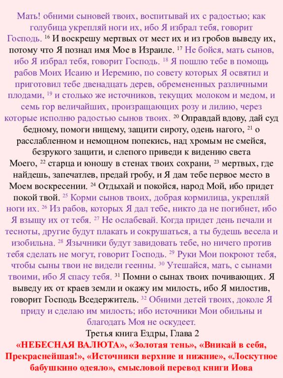 Мать! обними сыновей твоих, воспитывай их с радостью; как голубица укрепляй ноги их, ибо Я избрал тебя, говорит Господь. 16 И воскрешу мертвых от мест их и из гробов выведу их, потому что Я познал имя Мое в Израиле. 17 Не бойся, мать сынов, ибо Я избрал тебя, говорит Господь. 18 Я пошлю тебе в помощь рабов Моих Исаию и Иеремию, по совету которых Я освятил и приготовил тебе двенадцать дерев, обремененных различными плодами, 19 и столько же источников, текущих молоком и медом, и семь гор величайших, произращающих розу и лилию, через которые исполню радостью сынов твоих. 20 Оправдай вдову, дай суд бедному, помоги нищему, защити сироту, одень нагого, 21 о расслабленном и немощном попекись, над хромым не смейся, безрукого защити, и слепого приведи к видению света Моего, 22 старца и юношу в стенах твоих сохрани, 23 мертвых, где найдешь, запечатлев, предай гробу, и Я дам тебе первое место в Моем воскресении. 24 Отдыхай и покойся, народ Мой, ибо придет покой твой. 25 Корми сынов твоих, добрая кормилица, укрепляй ноги их. 26 Из рабов, которых Я дал тебе, никто да не погибнет, ибо Я взыщу их от тебя. 27 Не ослабевай. Когда придет день печали и тесноты, другие будут плакать и сокрушаться, а ты будешь весела и изобильна. 28 Язычники будут завидовать тебе, но ничего против тебя сделать не могут, говорит Господь. 29 Руки Мои покроют тебя, чтобы сыны твои не видели геенны. 30 Утешайся, мать, с сынами твоими, ибо Я спасу тебя. 31 Помни о сынах твоих почивающих. Я выведу их от краев земли и окажу им милость, ибо Я милостив, говорит Господь Вседержитель. 32 Обними детей твоих, доколе Я приду и сделаю им милость; ибо источники Мои обильны и благодать Моя не оскудеет. Третья книга Ездры, Глава 2 «НЕБЕСНАЯ ВАЛЮТА», «Золотая тень», «Вникай в себя, Прекраснейшая!», «Источники верхние и нижние», «Лоскутное бабушкино одеяло», смысловой перевод книги Иова