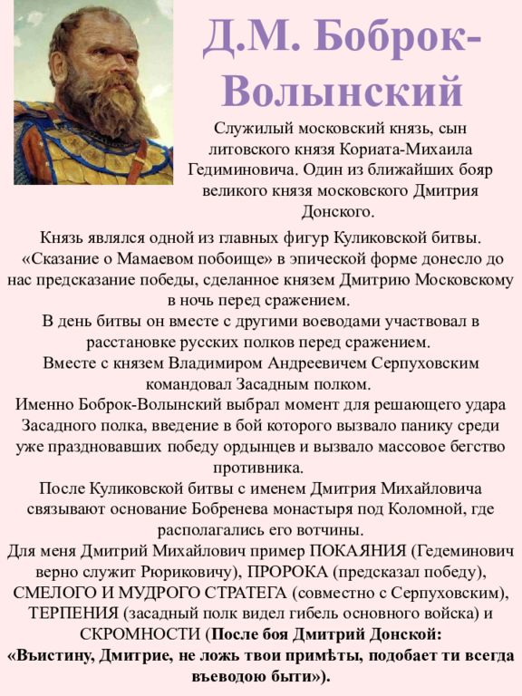 Д.М. Боброк-Волынский Служилый московский князь, сын литовского князя Кориата-Михаила Гедиминовича. Один из ближайших бояр великого князя московского Дмитрия Донского. Князь являлся одной из главных фигур Куликовской битвы. «Сказание о Мамаевом побоище» в эпической форме донесло до нас предсказание победы, сделанное князем Дмитрию Московскому в ночь перед сражением. В день битвы он вместе с другими воеводами участвовал в расстановке русских полков перед сражением. Вместе с князем Владимиром Андреевичем Серпуховским командовал Засадным полком. Именно Боброк-Волынский выбрал момент для решающего удара Засадного полка, введение в бой которого вызвало панику среди уже праздновавших победу ордынцев и вызвало массовое бегство противника. После Куликовской битвы с именем Дмитрия Михайловича связывают основание Бобренева монастыря под Коломной, где располагались его вотчины. Для меня Дмитрий Михайлович пример ПОКАЯНИЯ ( Гедеминович верно служит Рюриковичу), ПРОРОКА ( предсказал победу), СМЕЛОГО И МУДРОГО СТРАТЕГА (совместно с Серпуховским), ТЕРПЕНИЯ (засадный полк видел гибель основного войска) и СКРОМНОСТИ ( После боя Дмитрий Донской: « Въистину, Дмитрие, не ложь твои примѣты, подобает ти всегда въеводою быти »).