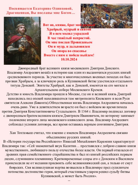 Двоюродный брат великого князя московского Дмитрия Донского. Владимир Андреевич вошёл в историю как один из выдающихся русских князей средневекового периода. За участие в многочисленных военных походах он был прозван Храбрым, а за ключевую роль в Куликовской битве удостоился отдельного титула Донской. Эпитеты Храбрый, как и Донской, имеются на его могиле в Архангельском соборе Московского Кремля. Детство и юность Владимира прошли в Москве, где он и великий князь Дмитрий находились под опекой находившегося там митрополита Киевского и всея Руси святителя Алексия ( Бяконта ).Общественная жизнь Владимира Андреевича началась очень рано. Уже в девятилетнем возрасте он был с войском во время похода против Дмитрия Константиновича Суздальского. В 1364 г. Владимир подписал договор с двоюродным братом великим князем Дмитрием Ивановичем, по которому занимает положение второго лица московского княжеского дома. Владимир Андреевич соблюдал условия договора, все время оставаясь верным союзником Дмитрия. Хан Тохтамыш считал, что именно с именем Владимира Андреевича связано объединение русских князей. В «Истории государства Российского» Николай Михайлович Карамзин характеризует Владимира так: «Сей знаменитый внук Калитин… преставился с доброю славою князя мужественного, любившего пользу отечества более власти. Он первый отказался от древних прав семейственного старейшинства и был из князей российских первым дядею, служившим племяннику. Кратковременные ссоры его с Донским и Василием происходили не от желания присвоить себе великокняжеский сан, а только от смут боярских. Сия великодушная жертва возвысила в Владимире пред судилищем потомства достоинство героя, который счастливым ударом решил судьбу битвы Куликовской, а может быть России». -- Вот он, княже, брат мой ратный Храбрый, мудрый и святой Я о нем молил украдкой В час тяжёлый непростой. Он мне послан Провиденьем Он и мудр, и дальновиден Он опора во спасенье Вместе с ним к победе выйдем! 10.10.2024 Посвящается Екатерине Одинцовой, Драгоценная, Вы посланы мне Богом…