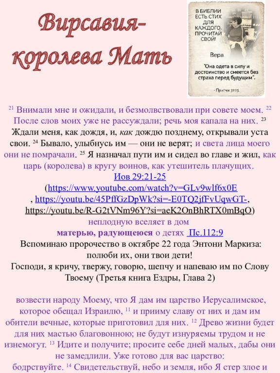 Вирсавия- королева Мать 21 Внимали мне и ожидали, и безмолвствовали при совете моем. 22 После слов моих уже не рассуждали; речь моя капала на них. 23 Ждали меня, как дождя, и, как дождю позднему, открывали уста свои. 24 Бывало, улыбнусь им — они не верят; и света лица моего они не помрачали. 25 Я назначал пути им и сидел во главе и жил, как царь (королева) в кругу воинов, как утешитель плачущих. Иов 29:21-25 ( https://www.youtube.com/watch?v=GLv9wlf6x0E , https://youtu.be/45PffGzDpWk?si=-E0TQ2jfFvUqwGT-, https://youtu.be/R-G2tVNm96Y?si=aeK2OnBhRTX0mBqO ) неплодную вселяет в дом матерью, радующеюся о детях Пс.112:9 Вспоминаю пророчество в октябре 22 года Энтони Маркиза: полюби их, они твои дети! Господи, я кричу, твержу, говорю, шепчу и напеваю им по Слову Твоему (Третья книга Ездры, Глава 2) возвести народу Моему, что Я дам им царство Иерусалимское, которое обещал Израилю, 11 и прииму славу от них и дам им обители вечные, которые приготовил для них. 12 Древо жизни будет для них мастью благовонною; не будут изнуряемы трудом и не изнемогут. 13 Идите и получите; просите себе дней малых, дабы они не замедлили. Уже готово для вас царство: бодрствуйте. 14 Свидетельствуй, небо и земля, ибо Я стер злое и сотворил доброе. Живу Я! говорит Господь.