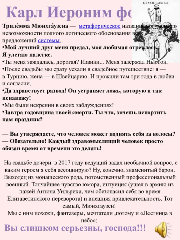 Карл Иероним фон Триле́мма Мюнхга́узена — метафорическое название аргумента о невозможности полного логического обоснования всех предложений системы. Мой лучший друг меня предал, моя любимая отреклась. Я улетаю налегке. Ты меня заждалась, дорогая? Извини... Меня задержал Ньютон. После свадьбы мы сразу уехали в свадебное путешествие: я — в Турцию, жена — в Швейцарию. И прожили там три года в любви и согласии. Да здравствует развод! Он устраняет ложь, которую я так ненавижу! Мы были искренни в своих заблуждениях! Завтра годовщина твоей смерти. Ты что, хочешь испортить нам праздник? — Вы утверждаете, что человек может поднять себя за волосы? — Обязательно! Каждый здравомыслящий человек просто обязан время от времени это делать! На свадьбе дочери в 2017 году ведущий задал необычной вопрос, с каким героем я себя ассоциирую? Ну, конечно, знаменитый барон. Выходец из монашеского рода, потомственный профессиональный военный. Тончайшее чувство юмора, интуиция (ушел в армию из пажей Антона Уильриха, чем обезопасил себя во время Елизаветинского переворота) и внешняя привлекательность. Тот самый, Мюнхгаузен! Мы с ним похожи, фантазеры, мечтатели,потому и «Лестница в небо»: Вы слишком серьезны, господа!!!