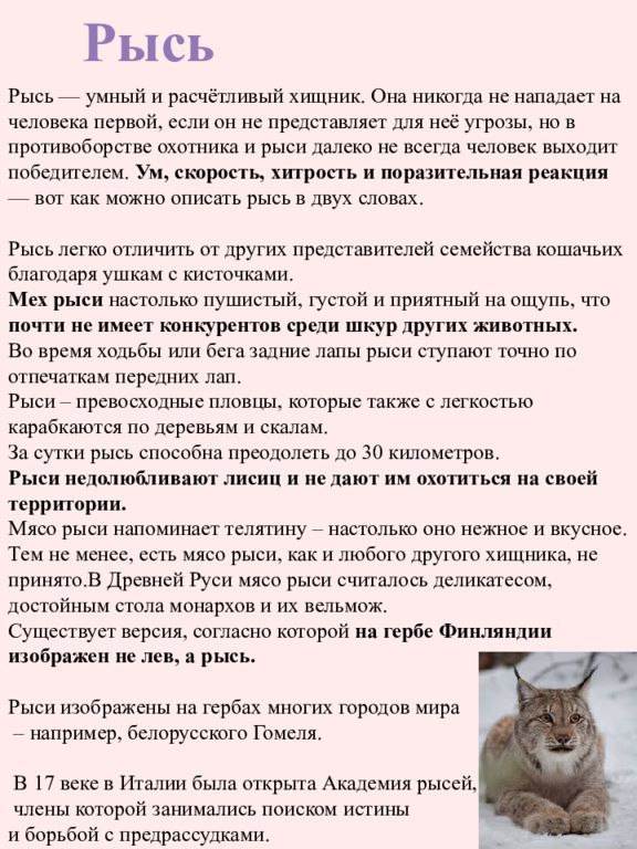 Рысь Рысь — умный и расчётливый хищник. Она никогда не нападает на человека первой, если он не представляет для неё угрозы, но в противоборстве охотника и рыси далеко не всегда человек выходит победителем. Ум, скорость, хитрость и поразительная реакция — вот как можно описать рысь в двух словах. Рысь легко отличить от других представителей семейства кошачьих благодаря ушкам с кисточками. Мех рыси настолько пушистый, густой и приятный на ощупь, что почти не имеет конкурентов среди шкур других животных. Во время ходьбы или бега задние лапы рыси ступают точно по отпечаткам передних лап. Рыси – превосходные пловцы, которые также с легкостью карабкаются по деревьям и скалам. За сутки рысь способна преодолеть до 30 километров. Рыси недолюбливают лисиц и не дают им охотиться на своей территории. Мясо рыси напоминает телятину – настолько оно нежное и вкусное. Тем не менее, есть мясо рыси, как и любого другого хищника, не принято.В Древней Руси мясо рыси считалось деликатесом, достойным стола монархов и их вельмож. Существует версия, согласно которой на гербе Финляндии изображен не лев, а рысь. Рыси изображены на гербах многих городов мира – например, белорусского Гомеля. В 17 веке в Италии была открыта Академия рысей, члены которой занимались поиском истины и борьбой с предрассудками.