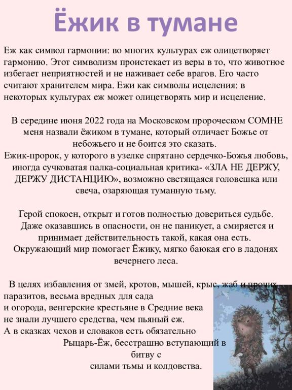 Ёжик в тумане Еж как символ гармонии: во многих культурах еж олицетворяет гармонию. Этот символизм проистекает из веры в то, что животное избегает неприятностей и не наживает себе врагов. Его часто считают хранителем мира. Ежи как символы исцеления: в некоторых культурах еж может олицетворять мир и исцеление. В середине июня 2022 года на Московском пророческом СОМНЕ меня назвали ёжиком в тумане, который отличает Божье от небожьего и не боится это сказать. Ежик-пророк, у которого в узелке спрятано сердечко-Божья любовь, иногда сучковатая палка-социальная критика- «ЗЛА НЕ ДЕРЖУ, ДЕРЖУ ДИСТАНЦИЮ», возможно светящаяся головешка или свеча, озаряющая туманную тьму. Герой спокоен, открыт и готов полностью довериться судьбе. Даже оказавшись в опасности, он не паникует, а смиряется и принимает действительность такой, какая она есть. Окружающий мир помогает Ёжику, мягко баюкая его в ладонях вечернего леса. В целях избавления от змей, кротов, мышей, крыс, жаб и прочих паразитов, весьма вредных для сада и огорода, венгерские крестьяне в Средние века не знали лучшего средства, чем пьяный еж. А в сказках чехов и словаков есть обязательно Рыцарь-Ёж, бесстрашно вступающий в битву с силами тьмы и колдовства.