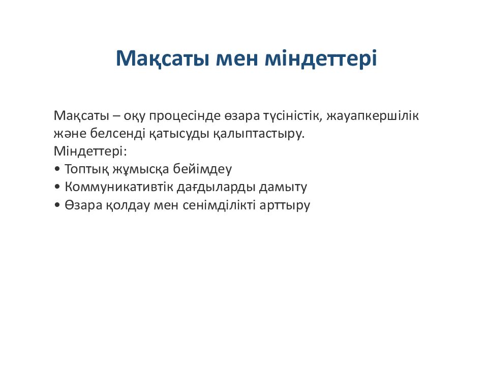 Мақсаты мен міндеттері Мақсаты – оқу процесінде өзара түсіністік, жауапкершілік және белсенді қатысуды қалыптастыру. Міндеттері: • Топтық жұмысқа бейімдеу • Коммуникативтік дағдыларды дамыту • Өзара қолдау мен сенімділікті арттыру