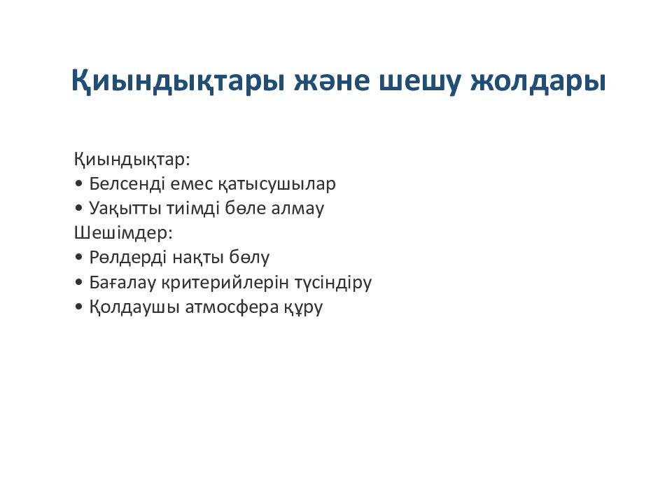 Қиындықтары және шешу жолдары Қиындықтар: • Белсенді емес қатысушылар • Уақытты тиімді бөле алмау Шешімдер: • Рөлдерді нақты бөлу • Бағалау критерийлерін түсіндіру • Қолдаушы атмосфера құру