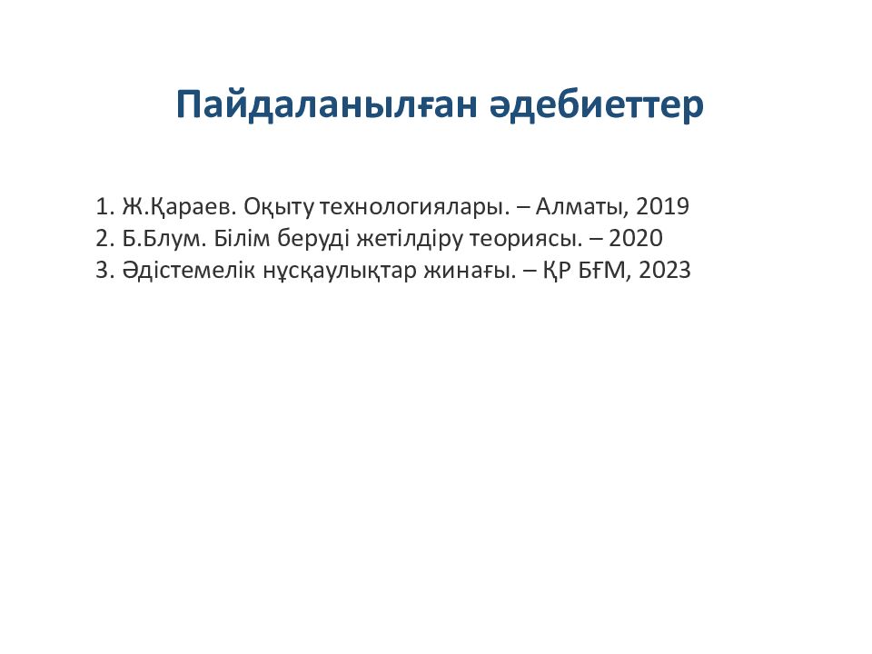 Пайдаланылған әдебиеттер 1. Ж.Қараев. Оқыту технологиялары. – Алматы, 2019 2. Б.Блум. Білім беруді жетілдіру теориясы. – 2020 3. Әдістемелік нұсқаулықтар жинағы. – ҚР БҒМ, 2023