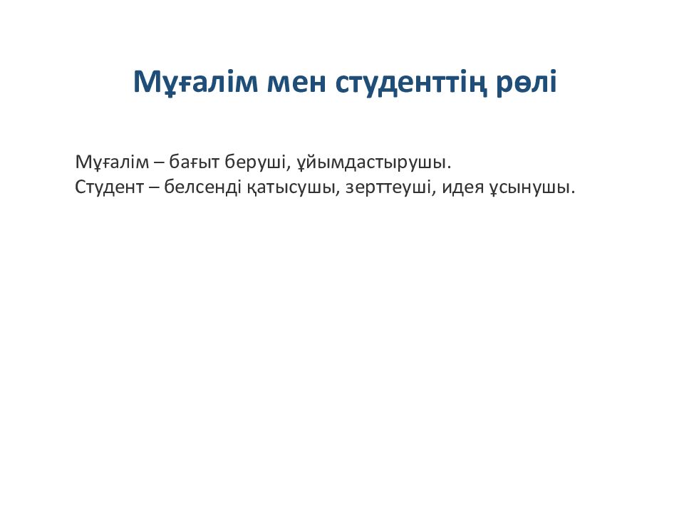 Мұғалім мен студенттің рөлі Мұғалім – бағыт беруші, ұйымдастырушы. Студент – белсенді қатысушы, зерттеуші, идея ұсынушы.