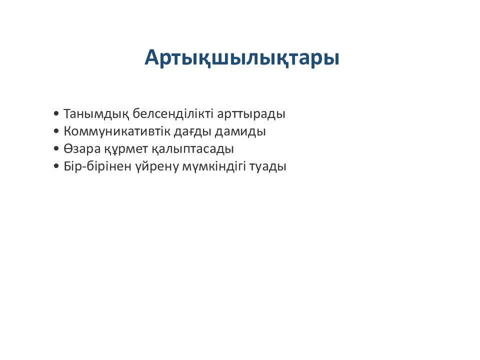 Артықшылықтары • Танымдық белсенділікті арттырады • Коммуникативтік дағды дамиды • Өзара құрмет қалыптасады • Бір-бірінен үйрену мүмкіндігі туады