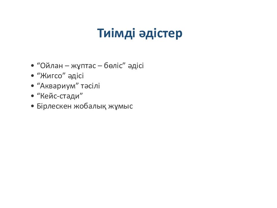 Тиімді әдістер • “Ойлан – жұптас – бөліс” әдісі • “Жигсо” әдісі • “Аквариум” тәсілі • “Кейс-стади” • Бірлескен жобалық жұмыс