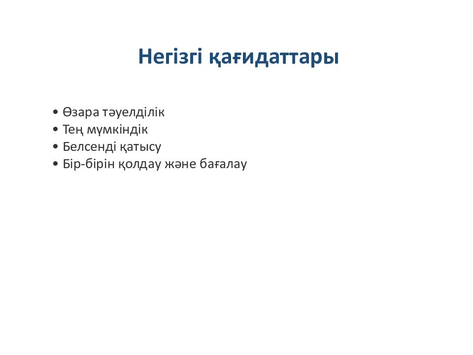 Негізгі қағидаттары • Өзара тәуелділік • Тең мүмкіндік • Белсенді қатысу • Бір-бірін қолдау және бағалау