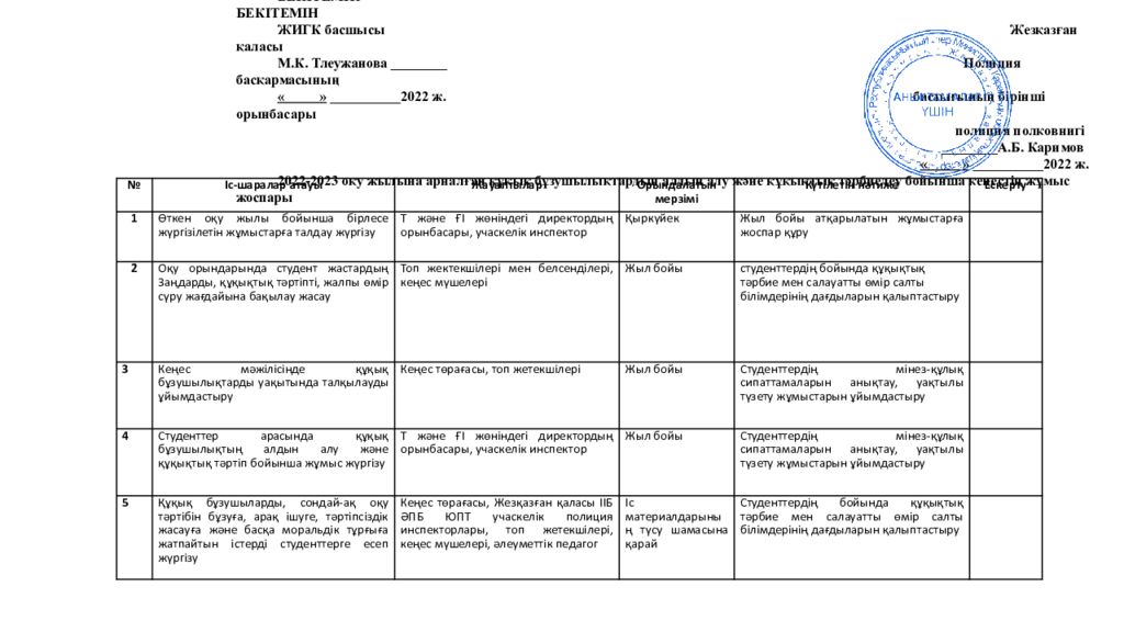 № Іс-ш аралар атауы Жауаптылар Орындалатын мерзімі Күтілетін нәтиже Ескерту 1 Өткен оқу жылы бойынша бірлесе жүргізілетін жұмыстарға талдау жүргізу Т және ҒІ жөніндегі директордың орынбасары, учаскелік инспектор Қыркүйек Жыл бойы атқарылатын жұмыстарға жоспар құру 2 Оқу орындарында студент жастардың Заңдарды, құқықтық тәртіпті, жалпы өмір сүру жағдайына бақылау жасау Топ жектекшілері мен белсенділері, кеңес мүшелері Жыл бойы студенттердің бойында құқықтық тәрбие мен салауатты өмір салты білімдерінің дағдыларын қалыптастыру 3 Кеңес мәжілісінде құқық бұзушылықтарды уақытында талқылауды ұйымдастыру Кеңес төрағасы, топ жетекшілері Жыл бойы Студенттердің мінез-құлық сипаттамаларын анықтау, уақтылы түзету жұмыстарын ұйымдастыру 4 Студенттер арасында құқық бұзушылықтың алдын алу және құқықтық тәртіп бойынша жұмыс жүргізу Т және ҒІ жөніндегі директордың орынбасары, учаскелік инспектор Жыл бойы Студенттердің мінез-құлық сипаттамаларын анықтау, уақтылы түзету жұмыстарын ұйымдастыру 5 Құқық бұзушыларды, сондай-ақ оқу тәртібін бұзуға, арақ ішуге, тәртіпсіздік жасауға және басқа моральдік тұрғыға жатпайтын істерді студенттерге есеп жүргізу Кеңес төрағасы, Жезқазған қаласы ІІБ ӘПБ ЮПТ учаскелік полиция инспекторлары, топ жетекшілері, кеңес мүшелері, әлеуметтік педагог Іс материалдарының түсу шамасына қарай Студенттердің бойында құқықтық тәрбие мен салауатты өмір салты білімдерінің дағдыларын қалыптастыру БЕКІТЕМІН БЕКІТЕМІН ЖИГК басшысы Жезқазған қаласы М.К. Тлеужанова ________ Полиция басқармасының « » __________2022 ж. бастығының бірінші орынбасары полиция полковнигі ________А.Б. Каримов « » __________2022 ж. 2022-2023 оқу жылына арналған құқық бұзушылықтардың алдын алу және құқықтық тәрбиелеу бойынша кеңестің жұмыс жоспары