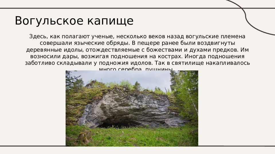 Здесь, как полагают ученые, несколько веков назад вогульские племена совершали языческие обряды. В пещере ранее были воздвигнуты деревянные идолы, отождествляемые с божествами и духами предков. Им возносили дары, возжигая подношения на кострах. Иногда подношения заботливо складывали у подножия идолов. Так в святилище накапливалось много серебра, пушнины.