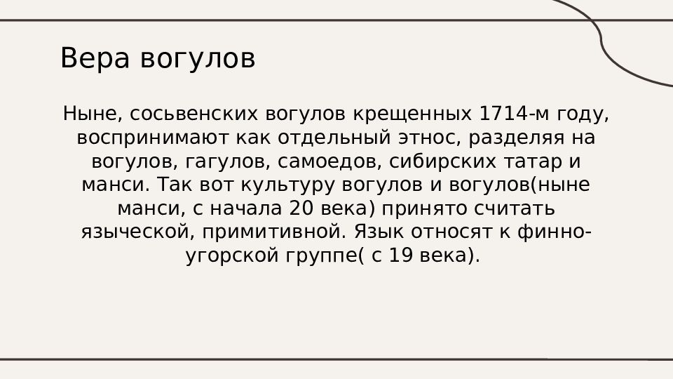 Ныне, сосьвенских вогулов крещенных 1714-м году, воспринимают как отдельный этнос, разделяя на вогулов, гагулов, самоедов, сибирских татар и манси. Так вот культуру вогулов и вогулов(ныне манси, с начала 20 века) принято считать языческой, примитивной. Язык относят к финно-угорской группе( с 19 века).