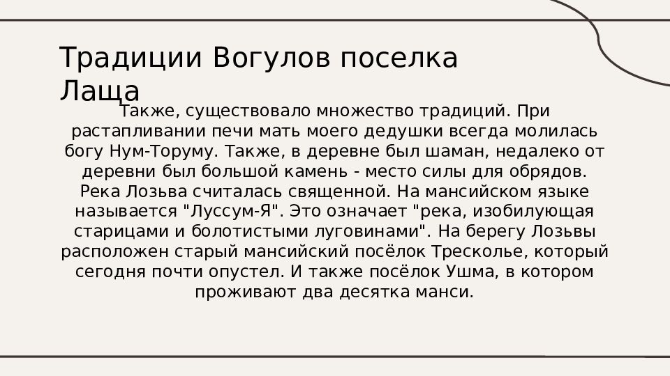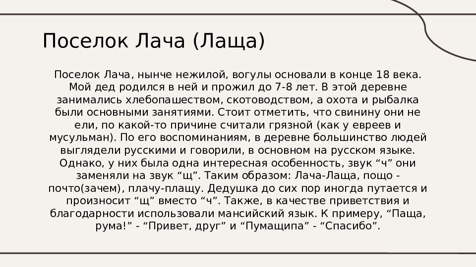 Поселок Лача, нынче нежилой, вогулы основали в конце 18 века. Мой дед родился в ней и прожил до 7-8 лет. В этой деревне занимались хлебопашеством, скотоводством, а охота и рыбалка были основными занятиями. Стоит отметить, что свинину они не ели, по какой-то причине считали грязной (как у евреев и мусульман). По его воспоминаниям, в деревне большинство людей выглядели русскими и говорили, в основном на русском языке. Однако, у них была одна интересная особенность, звук “ч” они заменяли на звук “щ”. Таким образом: Лача-Лаща, пощо - почто(зачем), плачу-плащу. Дедушка до сих пор иногда путается и произносит “щ” вместо “ч”. Также, в качестве приветствия и благодарности использовали мансийский язык. К примеру, “Паща, рума!” - “Привет, друг” и “Пумащипа” - “Спасибо”.