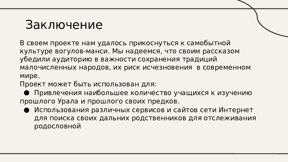 В своем проекте нам удалось прикоснуться к самобытной культуре вогулов-манси. Мы надеемся, что своим рассказом убедили аудиторию в важности сохранения традиций малочисленных народов, их риск исчезновения в современном мире. Проект может быть использован для: Привлечения наибольшее количество учащихся к изучению прошлого Урала и прошлого своих предков. Использования различных сервисов и сайтов сети Интернет для поиска своих дальних родственников для отслеживания родословной