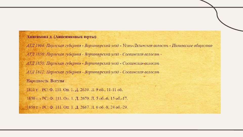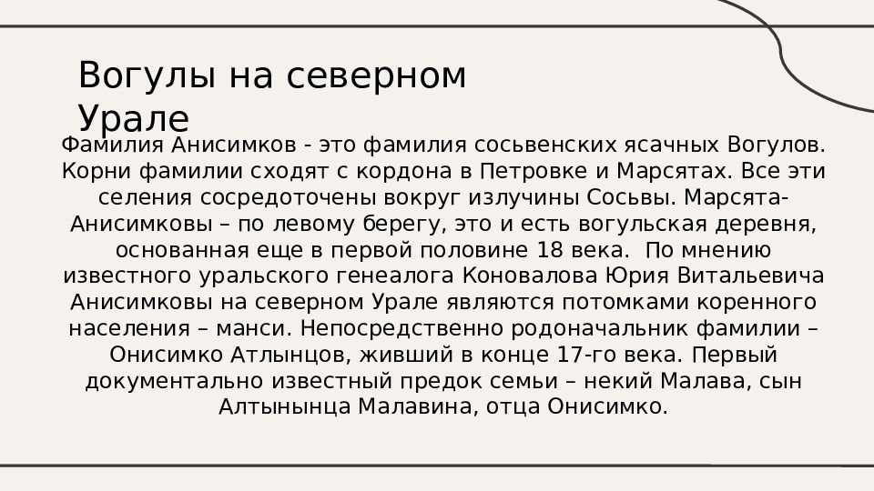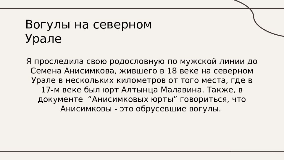 Я проследила свою родословную по мужской линии до Семена Анисимкова, жившего в 18 веке на северном Урале в нескольких километров от того места, где в 17-м веке был юрт Алтынца Малавина. Также, в документе “Анисимковых юрты” говориться, что Анисимковы - это обрусевшие вогулы.