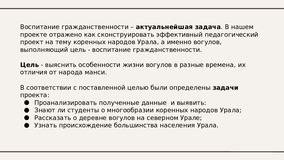 Воспитание гражданственности – актуальнейшая задача. В нашем проекте отражено как сконструировать эффективный педагогический проект на тему коренных народов Урала, а именно вогулов, выполняющий цель - воспитание гражданственности. Цель - выяснить особенности жизни вогулов в разные времена, их отличия от народа манси. В соответствии с поставленной целью были определены задачи проекта: Проанализировать полученные данные и выявить: Знают ли студенты о многообразии коренных народов Урала; Рассказать о деревне вогулов на северном Урале; Узнать происхождение большинства населения Урала.