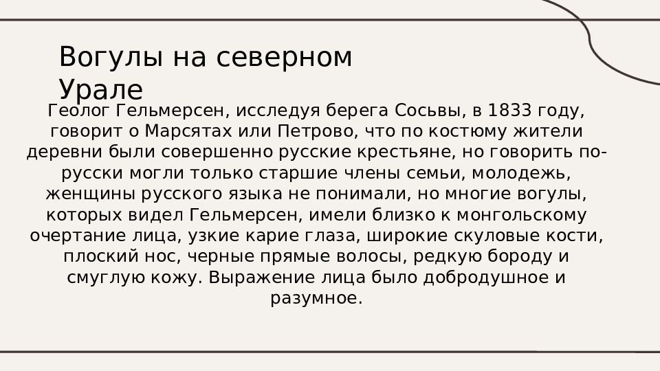 Геолог Гельмерсен, исследуя берега Сосьвы, в 1833 году, говорит о Марсятах или Петрово, что по костюму жители деревни были совершенно русские крестьяне, но говорить по-русски могли только старшие члены семьи, молодежь, женщины русского языка не понимали, но многие вогулы, которых видел Гельмерсен, имели близко к монгольскому очертание лица, узкие карие глаза, широкие скуловые кости, плоский нос, черные прямые волосы, редкую бороду и смуглую кожу. Выражение лица было добродушное и разумное.