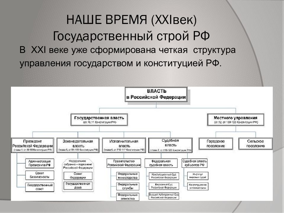 В XXI веке уже сформирована четкая структура управления государством и конституцией РФ.