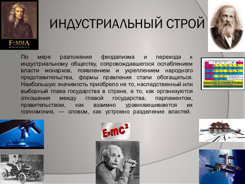 По мере разложения феодализма и перехода к индустриальному обществу, сопровождавшегося ослаблением власти монархов, появлением и укреплением народного представительства, формы правления стали обогащаться. Наибольшую значимость приобрело не то, наследственный или выборный глава государства в стране, а то, как организуются отношения между главой государства, парламентом, правительством, как взаимно уравновешиваются их полномочия, — словом, как устроено разделение властей.