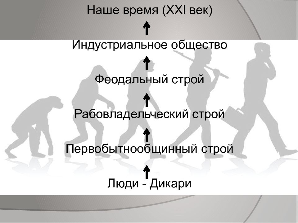 Наше время ( XXI век) Индустриальное общество Феодальный строй Рабовладельческий строй Первобытнообщинный строй Люди - Дикари