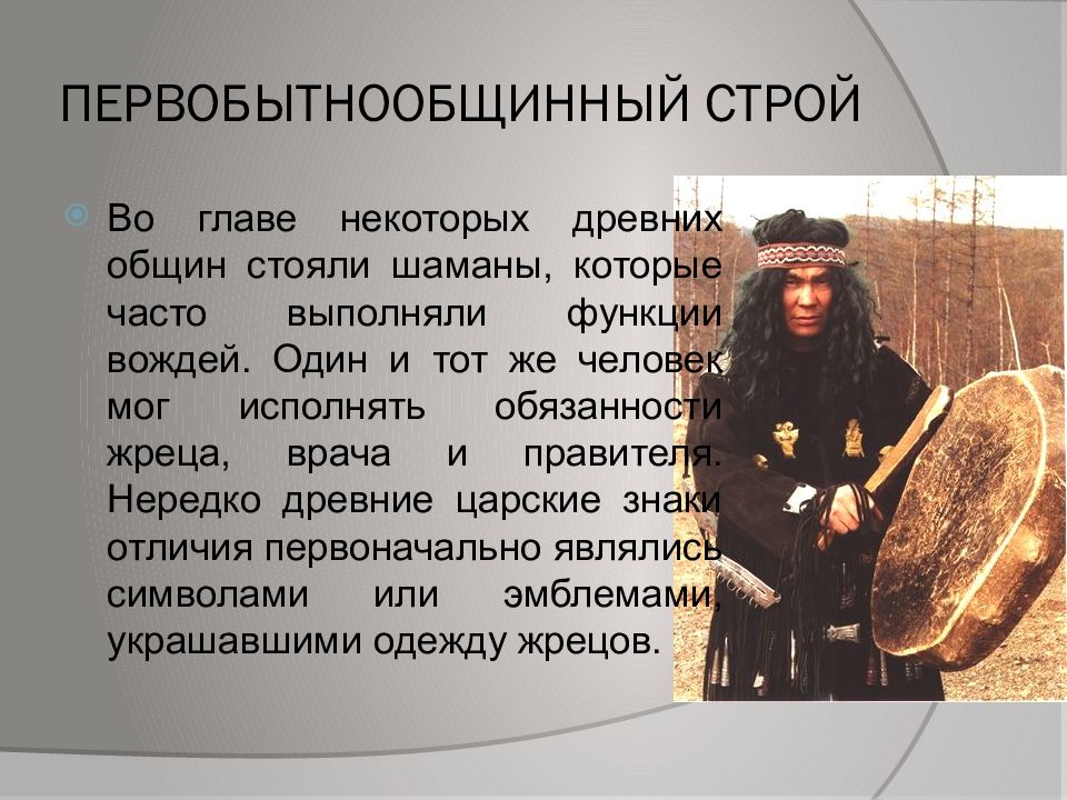 Во главе некоторых древних общин стояли шаманы, которые часто выполняли функции вождей. Один и тот же человек мог исполнять обязанности жреца, врача и правителя. Нередко древние царские знаки отличия первоначально являлись символами или эмблемами, украшавшими одежду жрецов.