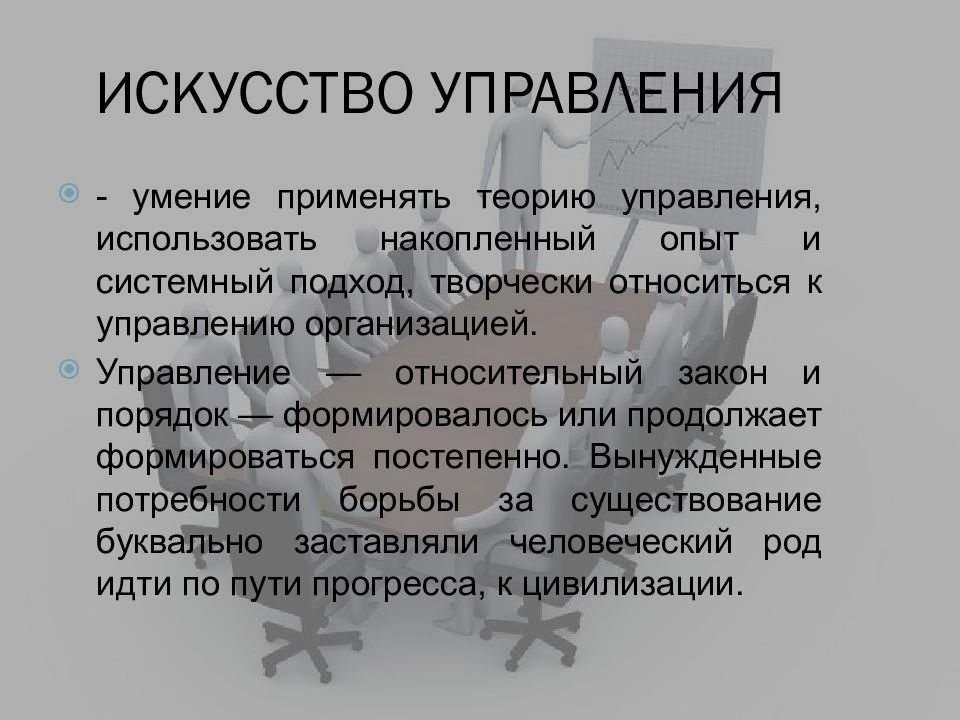 - умение применять теорию управления, использовать накопленный опыт и системный подход, творчески относиться к управлению организацией. Управление — относительный закон и порядок — формировалось или продолжает формироваться постепенно. Вынужденные потребности борьбы за существование буквально заставляли человеческий род идти по пути прогресса, к цивилизации.