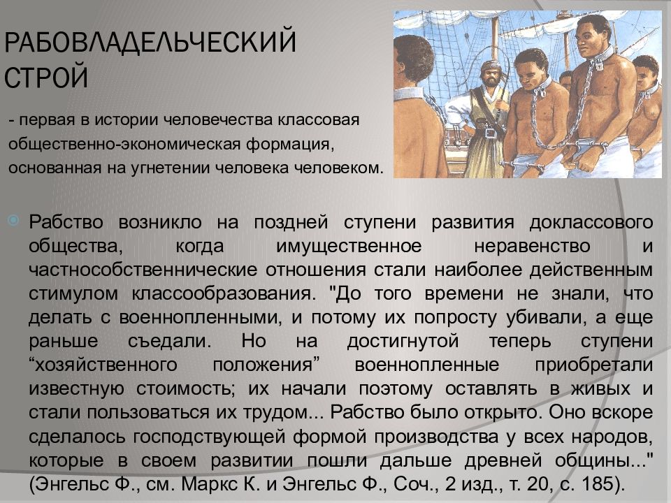 - первая в истории человечества классовая общественно-экономическая формация, основанная на угнетении человека человеком. Рабство возникло на поздней ступени развития доклассового общества, когда имущественное неравенство и частнособственнические отношения стали наиболее действенным стимулом классообразования. "До того времени не знали, что делать с военнопленными, и потому их попросту убивали, а еще раньше съедали. Но на достигнутой теперь ступени “хозяйственного положения” военнопленные приобретали известную стоимость; их начали поэтому оставлять в живых и стали пользоваться их трудом... Рабство было открыто. Оно вскоре сделалось господствующей формой производства у всех народов, которые в своем развитии пошли дальше древней общины..." (Энгельс Ф., см. Маркс К. и Энгельс Ф., Соч., 2 изд., т. 20, с. 185).