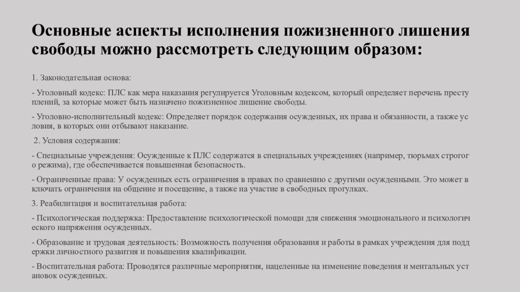 Слайд 3: Основные аспекты исполнения пожизненного лишения свободы можно рассмотреть следующим образом: