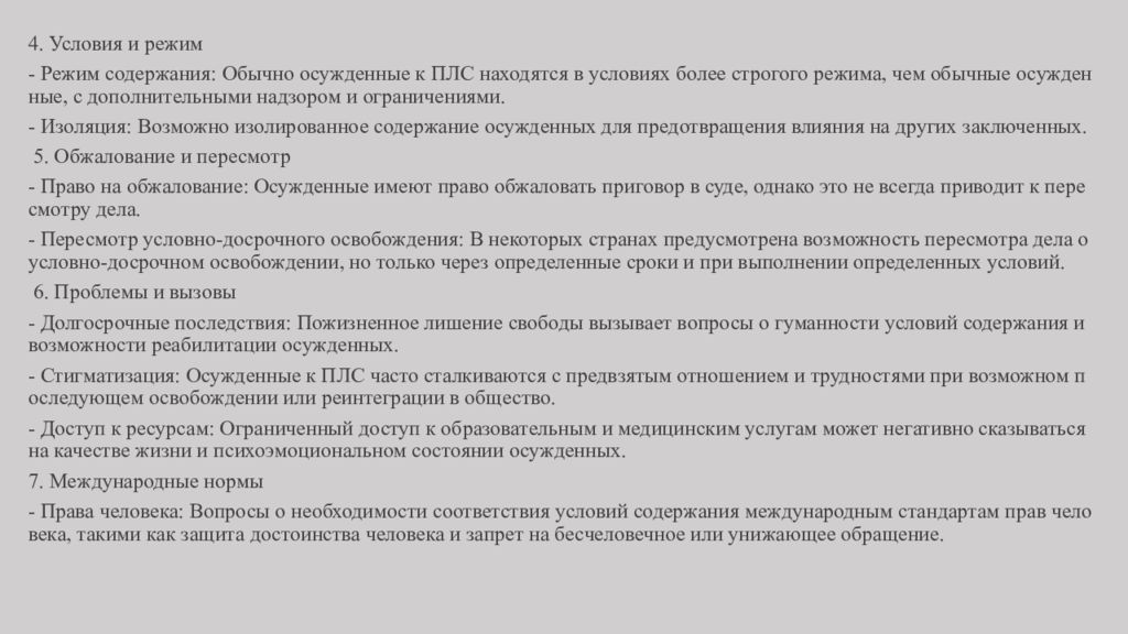 4. Условия и режим - Режим содержания: Обычно осужденные к ПЛС находятся в условиях более строгого режима, чем обычные осужденные, с дополнительными надзором и ограничениями. - Изоляция: Возможно изолированное содержание осужденных для предотвращения влияния на других заключенных. 5. Обжалование и пересмотр - Право на обжалование: Осужденные имеют право обжаловать приговор в суде, однако это не всегда приводит к пересмотру дела. - Пересмотр условно-досрочного освобождения: В некоторых странах предусмотрена возможность пересмотра дела о условно-досрочном освобождении, но только через определенные сроки и при выполнении определенных условий. 6. Проблемы и вызовы - Долгосрочные последствия: Пожизненное лишение свободы вызывает вопросы о гуманности условий содержания и возможности реабилитации осужденных. - Стигматизация: Осужденные к ПЛС часто сталкиваются с предвзятым отношением и трудностями при возможном последующем освобождении или реинтеграции в общество. - Доступ к ресурсам: Ограниченный доступ к образовательным и медицинским услугам может негативно сказываться на качестве жизни и психоэмоциональном состоянии осужденных. 7. Международные нормы - Права человека: Вопросы о необходимости соответствия условий содержания международным стандартам прав человека, такими как защита достоинства человека и запрет на бесчеловечное или унижающее обращение.