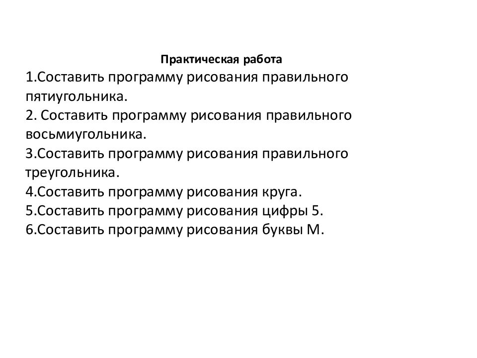 Практическая работа 1.Составить программу рисования правильного пятиугольника. 2. Составить программу рисования правильного восьмиугольника. 3. Составить программу рисования правильного треугольника. 4.Составить программу рисования круга. 5.Составить программу рисования цифры 5. 6.Составить программу рисования буквы М.