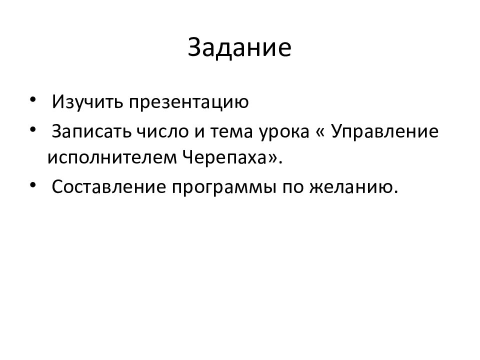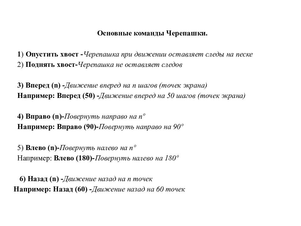 Основные команды Черепашки. 1 ) Oпустить хвост - Черепашка при движении оставляет следы на песке 2) Поднять хвост- Черепашка не оставляет следов 3) Вперед ( n ) - Движение вперед на n шагов (точек экрана) Например: Вперед (50) - Движение вперед на 50 шагов (точек экрана) 4) Вправо ( n )- Повернуть направо на n º Например: Вправо (90)- Повернуть направо на 90º 5) Влево ( n )- Повернуть налево на n º Например: Влево (180)- Повернуть налево на 180º 6) Назад ( n ) - Движение назад на n точек Например: Назад (60) - Движение назад на 60 точек