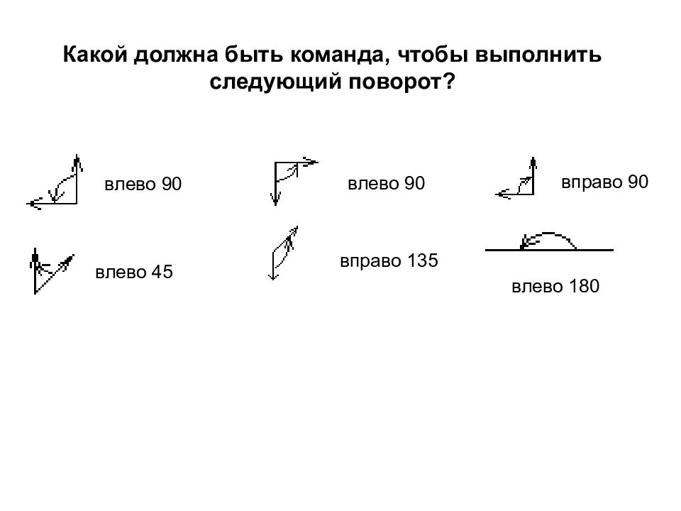 Какой должна быть команда, чтобы выполнить следующий поворот? влево 90 влево 45 влево 90 вправо 135 вправо 90 влево 180